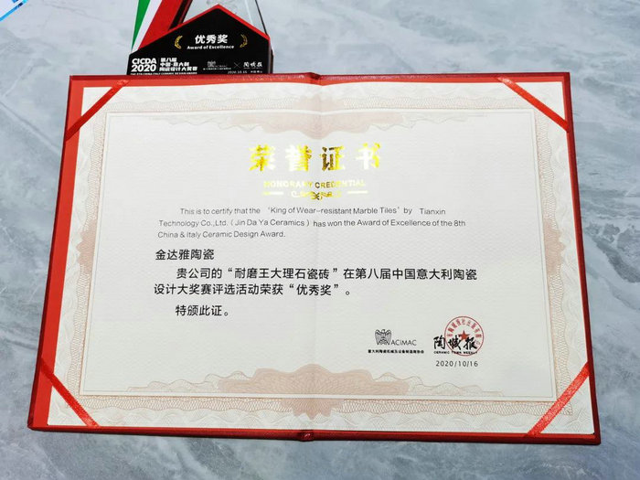 始于1999年國潮精品——金達雅陶瓷,憑借21年的高品質(zhì)仿古磚研發(fā)設計經(jīng)驗和精湛的生產(chǎn)工藝,此次推出的2020秋季新品——耐磨王大理石瓷磚,在本屆中國意大利陶瓷設計大賽上榮獲“優(yōu)秀獎”。